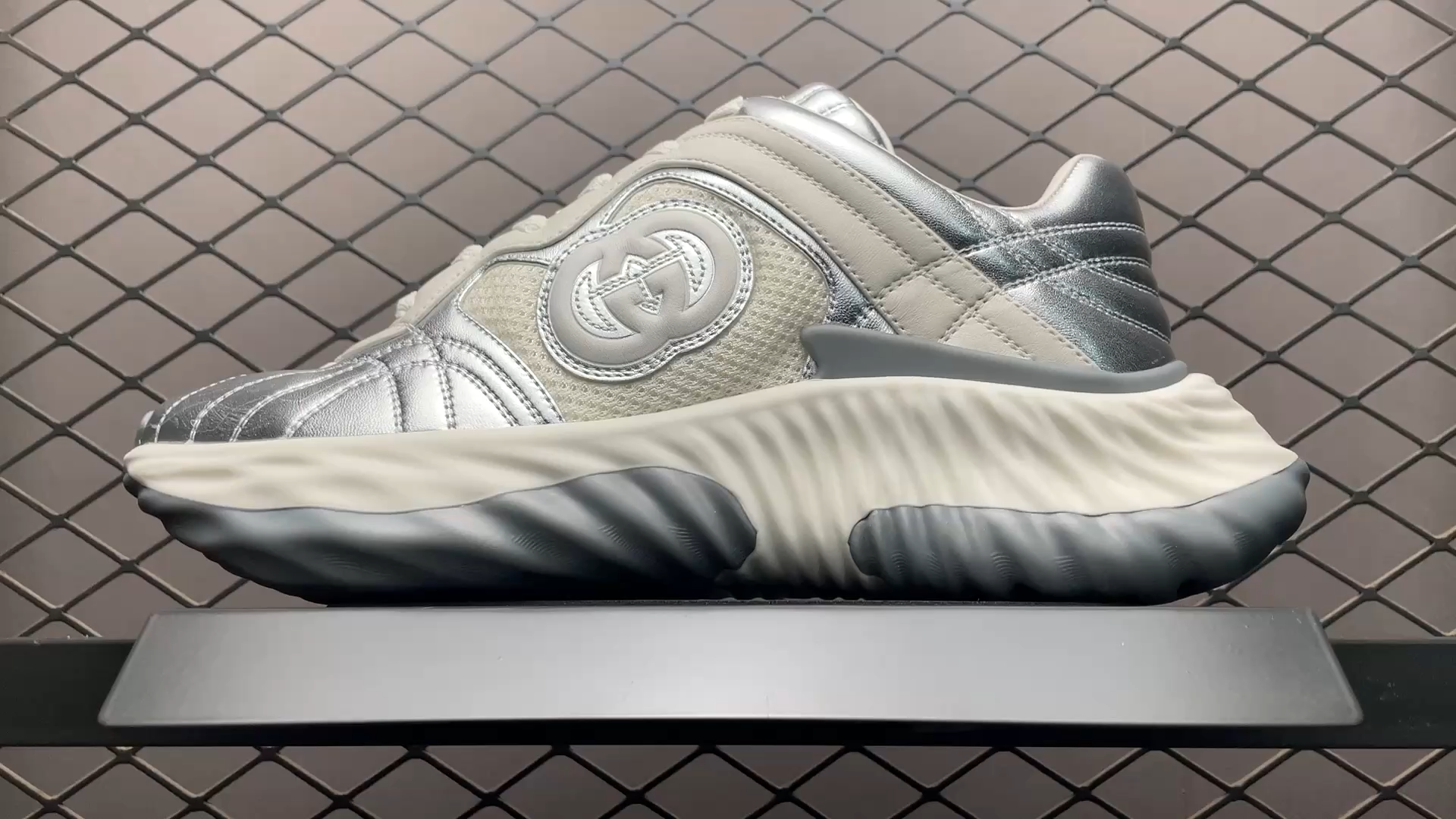 〔グッチ リップル〕は、革新的なステッチ技法で水面や波紋を表現したスニーカーです。アッパーからアウトソールにかけて、流れるように立体的に仕上げたインターロッキングG レザー パッチやGUCCI ロゴ メタル ハードウェアといったエレメンツをレザーに施しています。