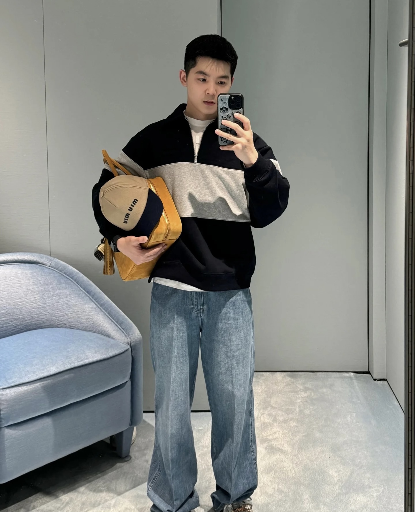 MIU MIU カラーブロック マイクロロゴ ハーフジップ スウェットシャツ 長袖 ブルーグレー