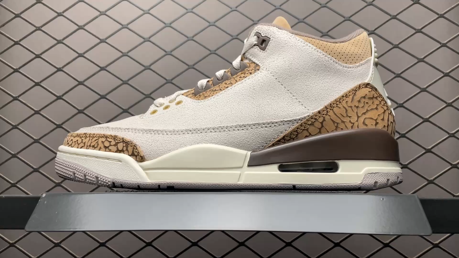 色合いの異なるブラウンを用いてアッパーを構築した今作。エアジョーダン3の象徴とも言える「エレファントプリント」には、渋さを感じるブラウンのカラーリングが施されたことで、大人の印象を感じるビジュアルになっている。また、シュータンに刻まれた「ジャンプマンロゴ」には、メタリックゴールドが配色されており、足元で程よく主張する上品な一足に仕上がった。1988年に天才的デザイナーのティンカー・ハットフィールド氏によって生み出されたエアジョーダン3。ジョーダンシリーズでお馴染みの「ジャンプマンロゴ」がデザインされたのはエアジョーダン3からであり、「エレファントプリント」や「ビジブルエア」などの革新的なデザインによって人気を博した。